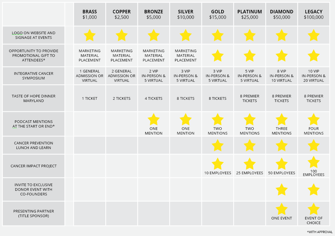 Become a sponsor and be part of something truly meaningful. Your sponsorship opens the door to unforgettable experiences—such as gifting tickets to our signature culinary event, the Integrative Cancer Symposium, and more—while bringing your team or family together around real, life-changing impact. Through our Cancer Impact Program and personalized Lunch & Learns, your partnership fosters connection, purpose, and a tangible way to support those facing and fighting cancer.